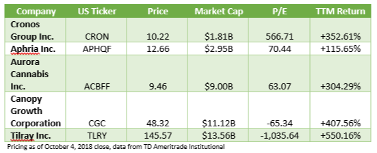 Ignore that return column on the far-right, because it doesn't matter. What I want you to pay attention to here is the cumulative market capitalization of just these five Canadian cannabis companies. As of today, these five Canadian companies alone account for almost $40 billion in market cap, about half of the global market cap of all cannabis companies…in a market estimated to have 2018 sales of $1.3 billion (remember these companies can’t currently sell to the US).