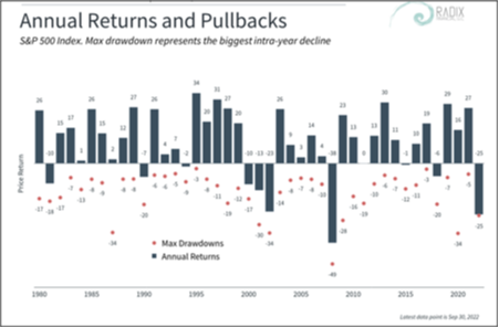 Consider the chart below. Since 1980, the S&P 500 has been down over 20% intra-year eight other times. And every time, recovering to new highs. In three of these instances, the market recovered to finish positive on the year (1987, 2009, and 2020). In four other instances, the market went on to return over 20% in the year following (1991, 2003, 2009, and 2021).