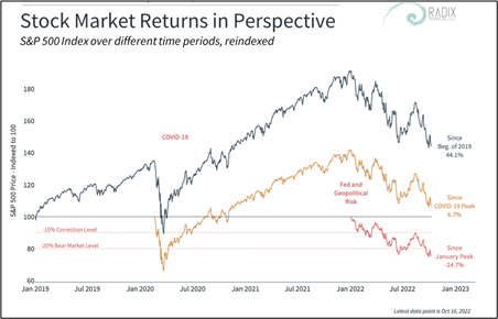 For those on the edge of their seats in this environment, it’s worth stepping back to look at some different time periods for perspective. While S&P returns are down 25% year-to-date through the end of September, the index is still positive since the Covid-19 peak in January 2020 and up over 45% since the beginning of 2019 (inclusive of this year’s bear market). It’s natural for short-term performance to make us uncomfortable, but it’s important not to lose sight of our long-term goals.